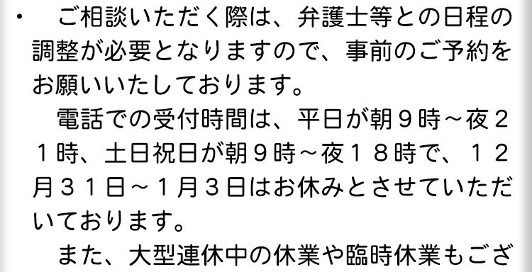 松阪駅の近くに事務所がありますし、電話・テレビ電話でご相談いただくこともできます。