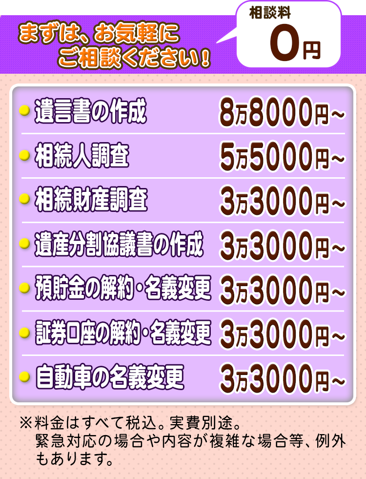 預金の解約・名義変更などはもちろん、相続人や財産の調査、遺産分割協議書の作成などについても承ることができます。