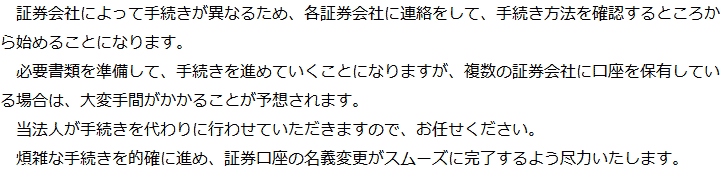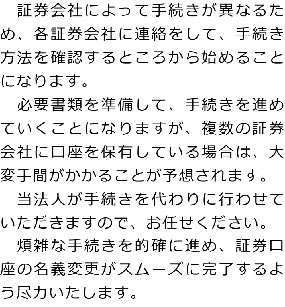 トップ業務内容証券口座の解約・名義変更 階層構造▼ 業務内容(目次) 証券口座の解約・名義変更 業務内容(目次)業務内容トップ行政書士法人心の業務内容遺言遺産整理相続人調査相続財産調査遺産分割協議書の作成預金・貯金の解約・名義変更証券口座の解約・名義変更自動車の名義変更心グループのその他の業務内容家族信託・民事信託節税対策事業承継遺言の検認相続放棄限定承認遺産分割遺留分侵害額請求相続登記相続税申告相続税調査 受付時間 平日 9時~21時、土日祝 9時~18時 夜間・土日祝の相談も対応します (要予約) 所在地 〒515-0017 三重県松阪市京町508-1101ビル4F 0120-2403-39 お問合せ・アクセス・地図