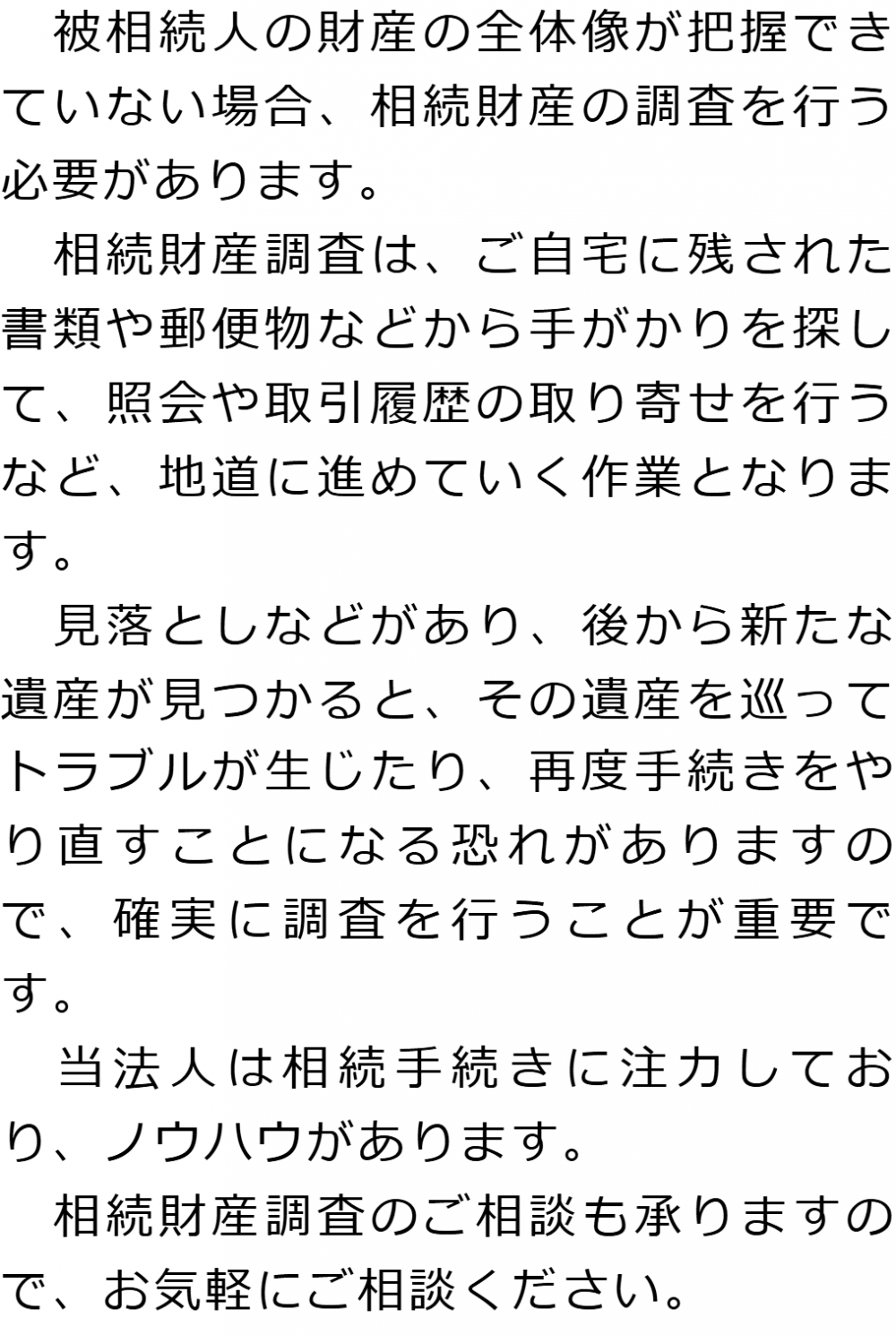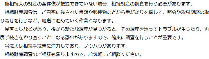 トップ業務内容相続財産調査 階層構造▼ 業務内容(目次) 相続財産調査 業務内容(目次)業務内容トップ行政書士法人心の業務内容遺言遺産整理相続人調査相続財産調査遺産分割協議書の作成預金・貯金の解約・名義変更証券口座の解約・名義変更自動車の名義変更心グループのその他の業務内容家族信託・民事信託節税対策事業承継遺言の検認相続放棄限定承認遺産分割遺留分侵害額請求相続登記相続税申告相続税調査 受付時間 平日 9時~21時、土日祝 9時~18時 夜間・土日祝の相談も対応します (要予約) 所在地 〒515-0017 三重県松阪市京町508-1101ビル4F 0120-2403-39 お問合せ・アクセス・地図