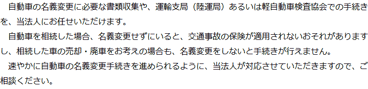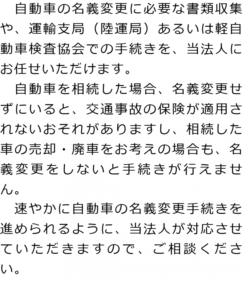 トップ業務内容自動車の名義変更 階層構造▼ 業務内容(目次) 自動車の名義変更 業務内容(目次)業務内容トップ行政書士法人心の業務内容遺言遺産整理相続人調査相続財産調査遺産分割協議書の作成預金・貯金の解約・名義変更証券口座の解約・名義変更自動車の名義変更心グループのその他の業務内容家族信託・民事信託節税対策事業承継遺言の検認相続放棄限定承認遺産分割遺留分侵害額請求相続登記相続税申告相続税調査 受付時間 平日 9時~21時、土日祝 9時~18時 夜間・土日祝の相談も対応します (要予約) 所在地 〒515-0017 三重県松阪市京町508-1101ビル4F 0120-2403-39 お問合せ・アクセス・地図