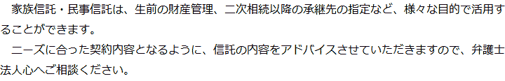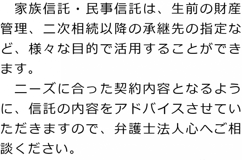 トップ業務内容家族信託・民事信託 階層構造▼ 業務内容(目次) 家族信託・民事信託 業務内容(目次)業務内容トップ行政書士法人心の業務内容遺言遺産整理相続人調査相続財産調査遺産分割協議書の作成預金・貯金の解約・名義変更証券口座の解約・名義変更自動車の名義変更心グループのその他の業務内容家族信託・民事信託節税対策事業承継遺言の検認相続放棄限定承認遺産分割遺留分侵害額請求相続登記相続税申告相続税調査 受付時間 平日 9時~21時、土日祝 9時~18時 夜間・土日祝の相談も対応します (要予約) 所在地 〒515-0017 三重県松阪市京町508-1101ビル4F 0120-2403-39 お問合せ・アクセス・地図