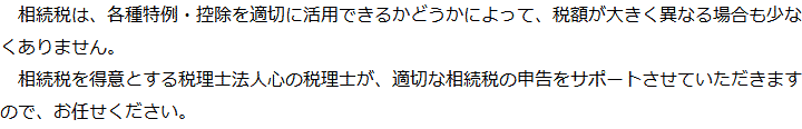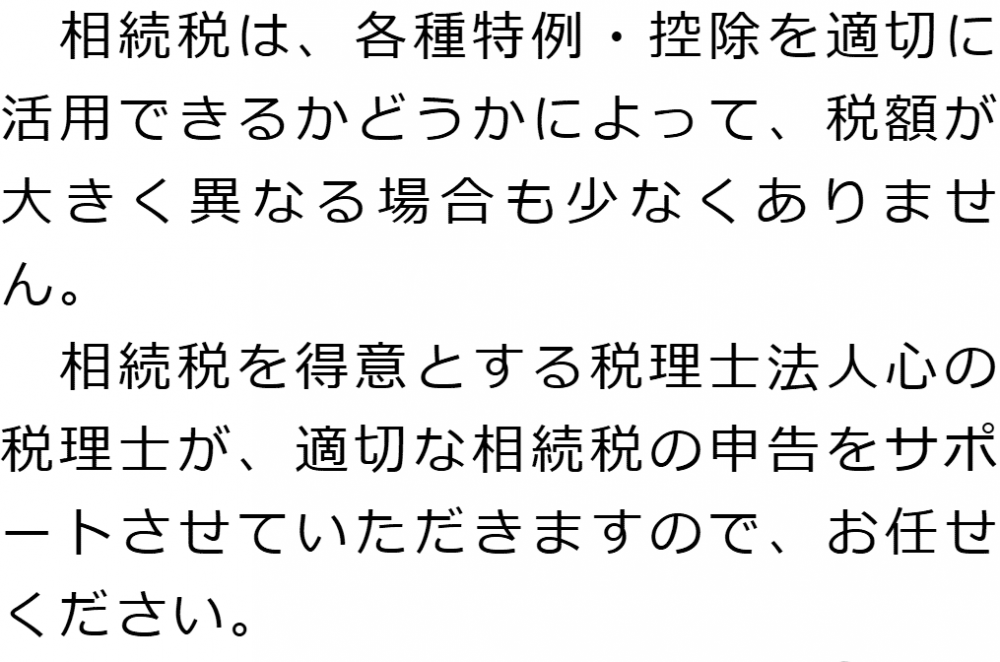 トップ業務内容相続税申告 階層構造▼ 業務内容(目次) 相続税申告 業務内容(目次)業務内容トップ行政書士法人心の業務内容遺言遺産整理相続人調査相続財産調査遺産分割協議書の作成預金・貯金の解約・名義変更証券口座の解約・名義変更自動車の名義変更心グループのその他の業務内容家族信託・民事信託節税対策事業承継遺言の検認相続放棄限定承認遺産分割遺留分侵害額請求相続登記相続税申告相続税調査 受付時間 平日 9時~21時、土日祝 9時~18時 夜間・土日祝の相談も対応します (要予約) 所在地 〒515-0017 三重県松阪市京町508-1101ビル4F 0120-2403-39 お問合せ・アクセス・地図